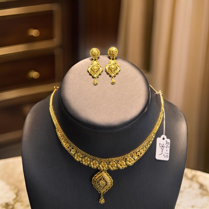The exquisite gold necklace and earrings showcased in our jewelry store are the epitome of elegance and sophistication. Crafted from the finest quality gold, these stunning pieces are perfect for any special occasion, whether it be a wedding, bridal event, or a glamorous party. The intricate design of the necklace and earrings exudes luxury and timeless beauty, making them a must-have addition to any jewelry collection. The radiant shine of the gold will catch the light and draw attention to the wearer, making them the center of attention wherever they go.